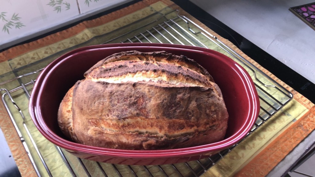 Au bout de ce temps, enfourner avec le couvercle dans un four à température de 230° (mon four ne monte pas plus haut) pour 50 mn puis retirer le couvercle en faisant attention de ne pas vous brûler et poursuivre la cuisson 10 mn. A la fin de la cuisson, sortir délicatement le moule et le déposer sur une grille. Attendre 10 mn pour retirer le pain et le laisser suer sur une grille avant dégustation.